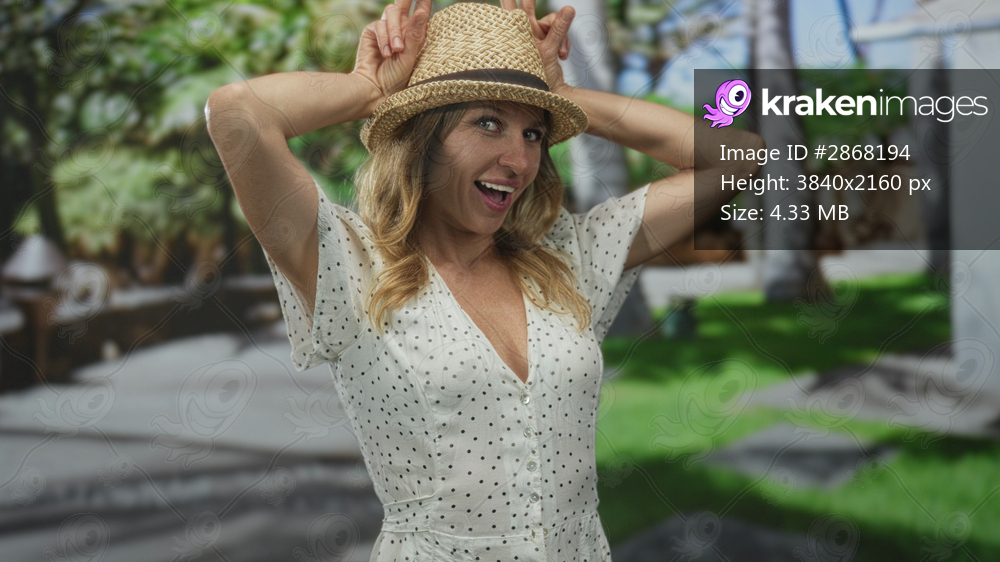 Woman in white polka dot dress holds straw hat with both hands over head, winking and smiling in a forest setting; vacation joy.