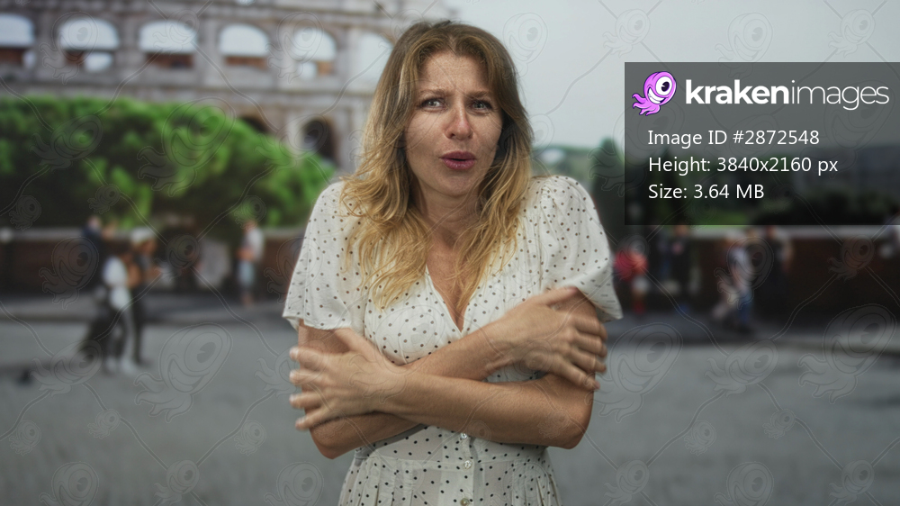 Woman in white polka dot dress with raised hands and tense fingers at roman coliseum building, mouth open in startled expression; anxiety.