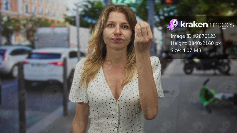Woman in white polka dot dress raises hand with palm forward on a busy city street near parked cars and scooters; frustration resolve.