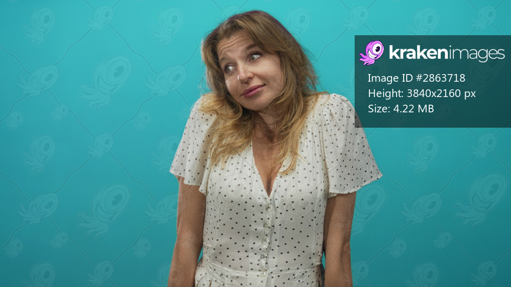 Woman in white polka dot dress shrugs shoulders in studio against teal backdrop, centered torso visible and casual expression; bemusement doubt.