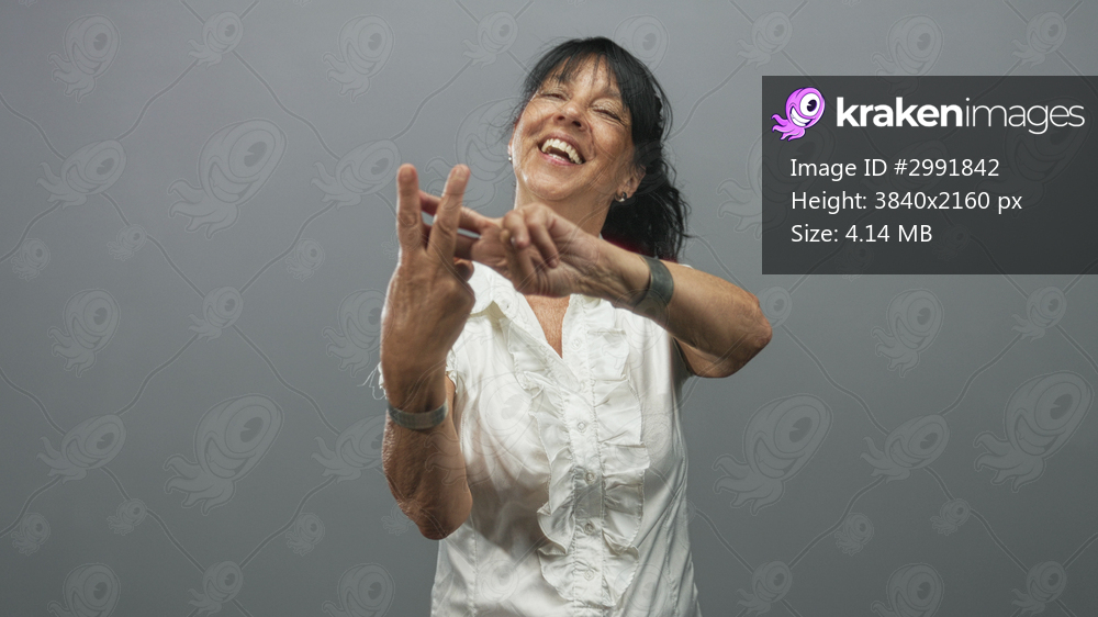 Woman in white ruffled blouse forms a hashtag with fingers and points toward camera in a grey studio; playful confidence.
