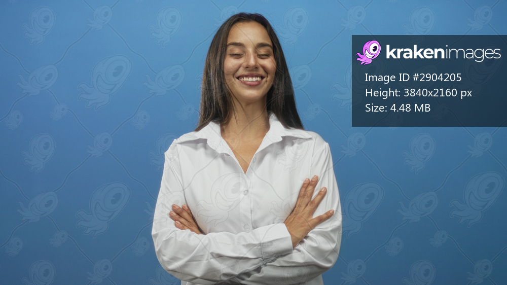 Woman in white shirt with arms crossed smiling at camera in studio; confidence friendly approachable poised.