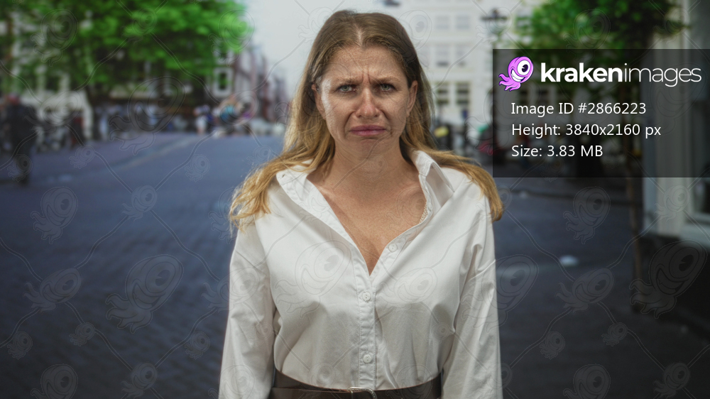 Woman in white shirt with belted waist sticking tongue out while looking sideways on city street; annoyance urban life.