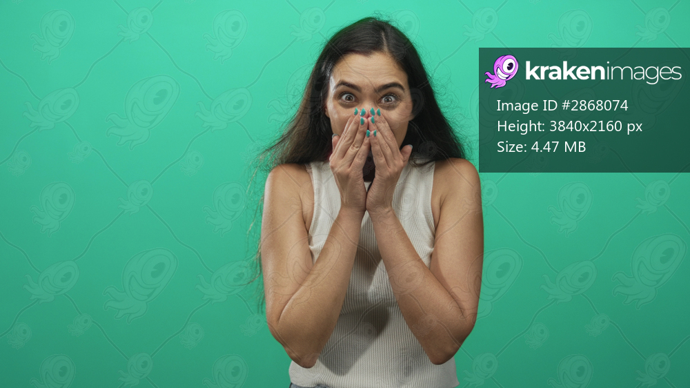 Woman in white shirt covers mouth with hands in studio setting while gazing wide eyed in animated expression; surprise.