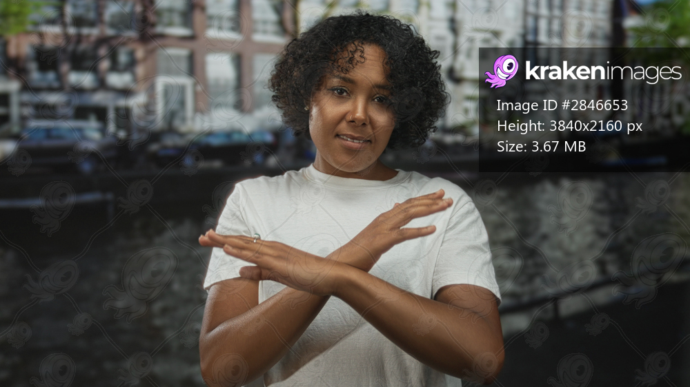 Woman in white shirt crosses arms by canal on street under bright sunlight; rejection refusal defiance.