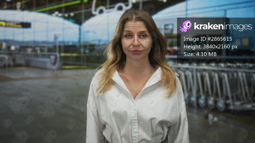 Woman in white shirt with eyes closed and slight frown standing in airport terminal near luggage trolleys and glass facade; travel fatigue.