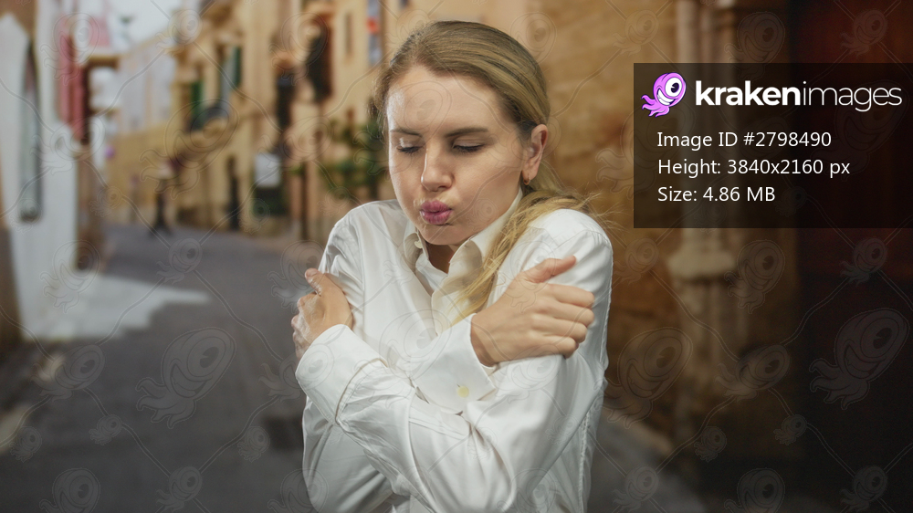 Woman in white shirt feeling cold in an old city street, embracing herself to stay warm amidst the medieval outdoor scenery.