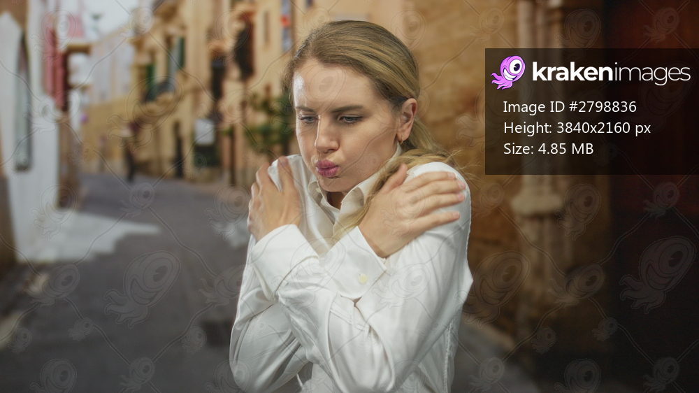 Woman in white shirt feeling cold in an old city street, embracing herself to stay warm amidst the medieval outdoor scenery.