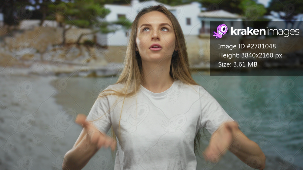 Woman in white shirt gesturing with hands on sunny beach near sea and outdoor houses