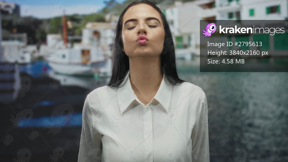 Woman in white shirt gesturing heart with hands and blowing kiss at vibrant port with boats in background under sunny outdoor setting.