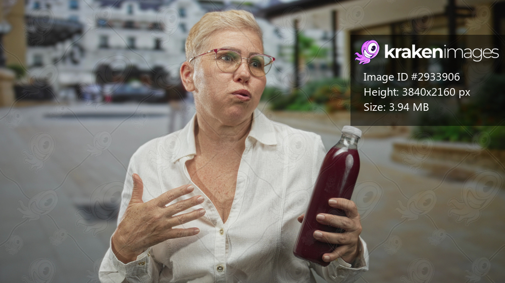 Woman in white shirt and glasses holding a juice bottle, left hand to chest and right hand gripping the bottle on street; surprise curiosity health.