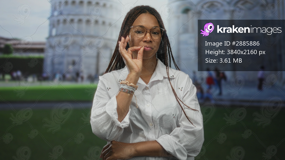 Woman in white shirt and glasses holding an ok sign with right hand near mouth, arms folded, posed in front of the leaning pisa tower building; quiet confidence. - Kraken Images
