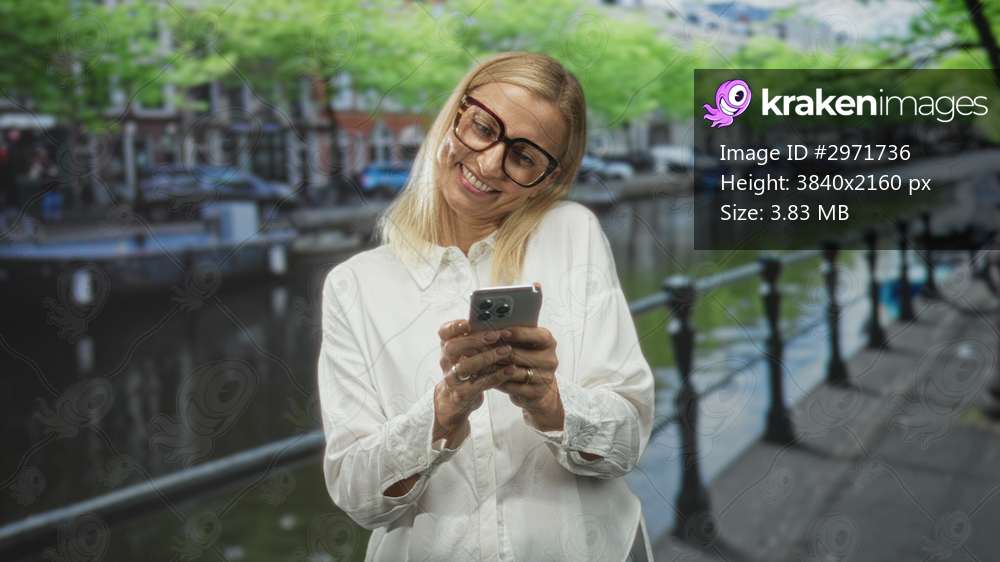Woman in white shirt and glasses holding smartphone, smiling and tapping screen beside a canal railing on street; joy connection.