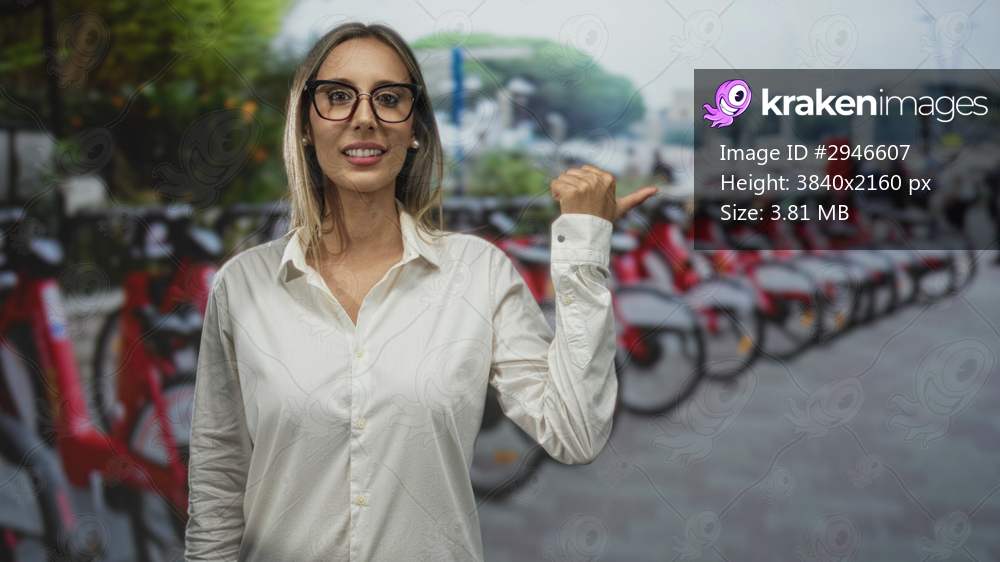 Woman in white shirt and glasses points thumb back at a row of rental bikes parked on a city street; confidence mobility.