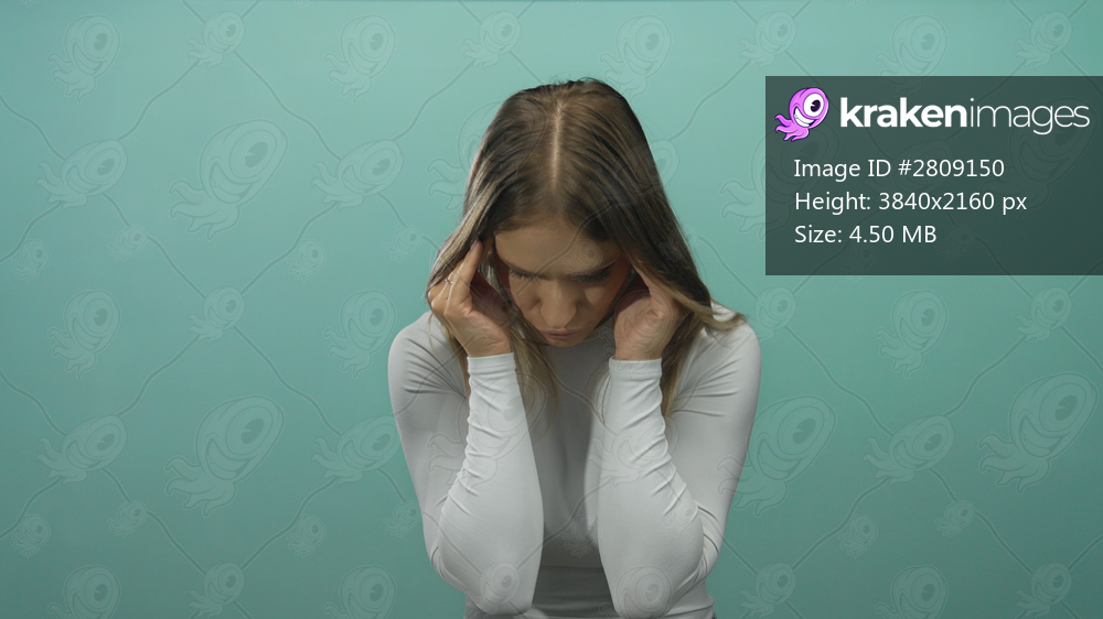 Woman in white shirt with hands on temples against isolated green background, expressing stress and contemplation.