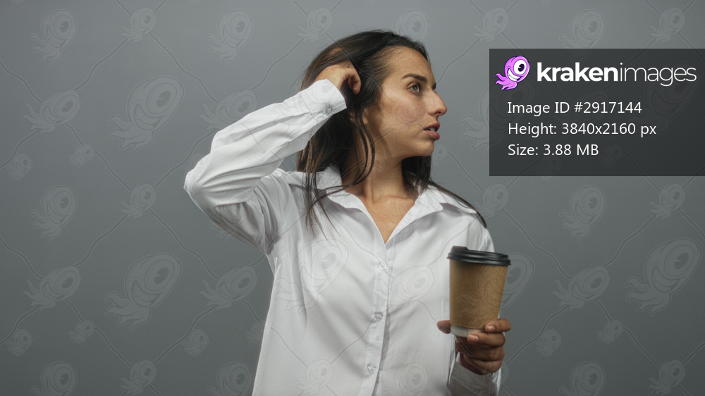 Woman in white shirt holding paper coffee cup and scratching head in studio with gray backdrop; confusion fatigue.