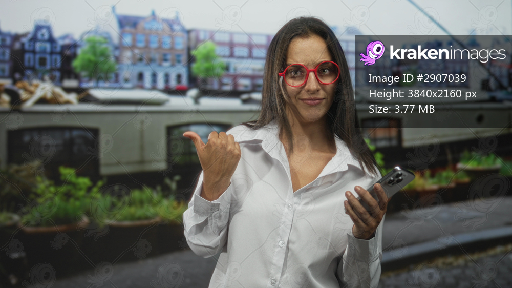 Woman in white shirt holding smartphone and thumb pointing to side on a street with canal boat and buildings; skepticism.