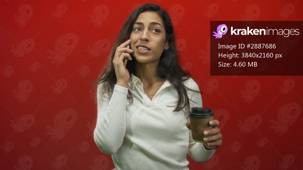 Woman in white shirt holding takeaway coffee cup and talking on phone while looking up in red studio; frustration.