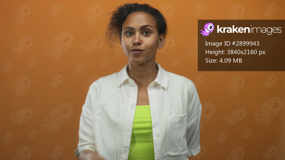 Woman in white shirt and lime top turning head to the side, showing neck in orange studio; calm introspection.