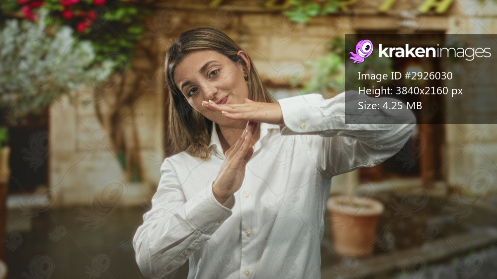Woman in white shirt makes time out sign with hands at a stone building courtyard by potted plants and doorway; boundary setting determination.