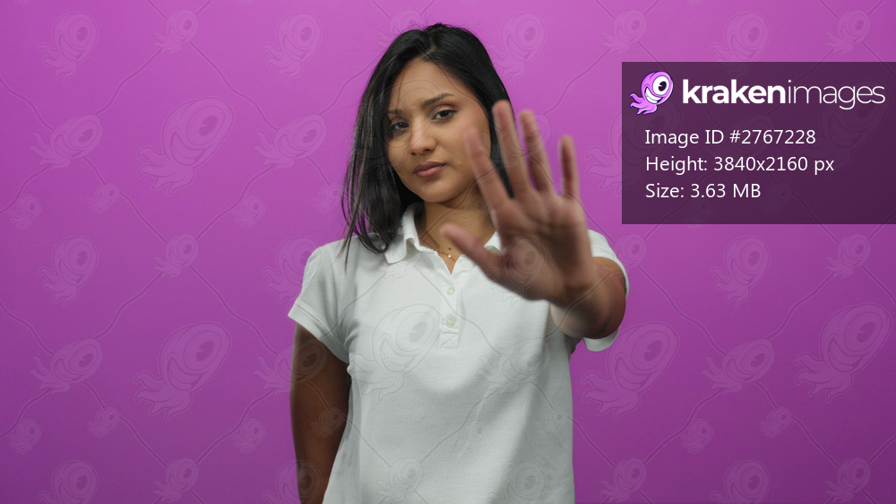 Woman in white shirt making stop gesture with hand against vibrant pink background, conveying denial or refusal in an isolated setting.