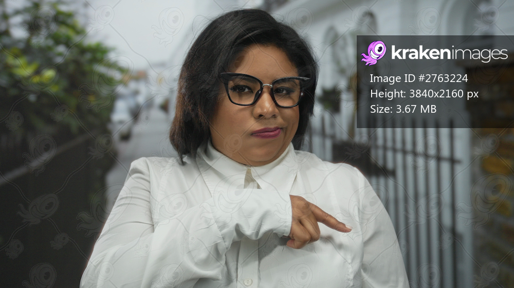 Woman in white shirt on city street showing different emotions and gestures outdoors, emphasizing diversity and body positivity in an urban latin american setting. - Kraken Images