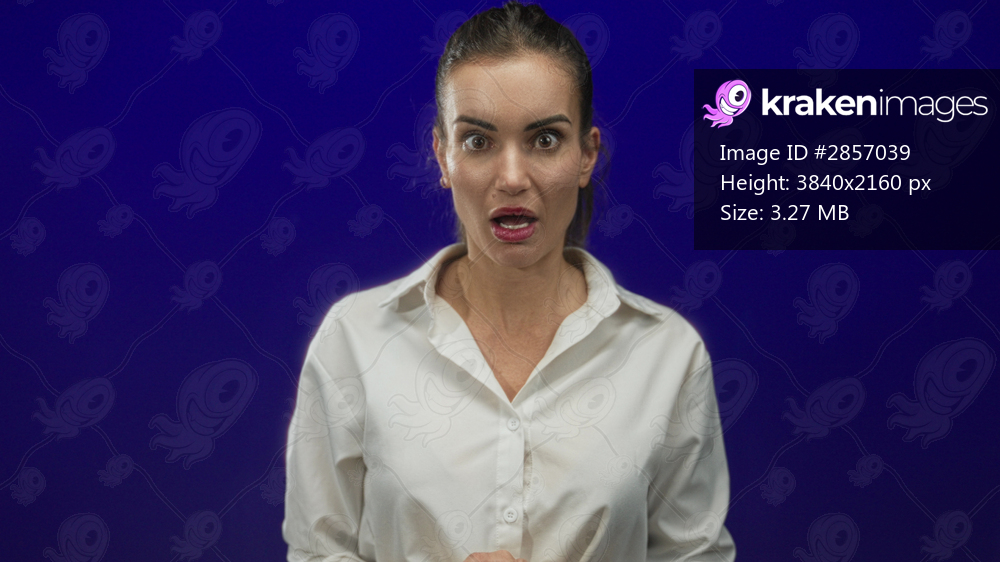 Woman in white shirt with open mouth points finger to chest in studio under blue light; surprise doubt.