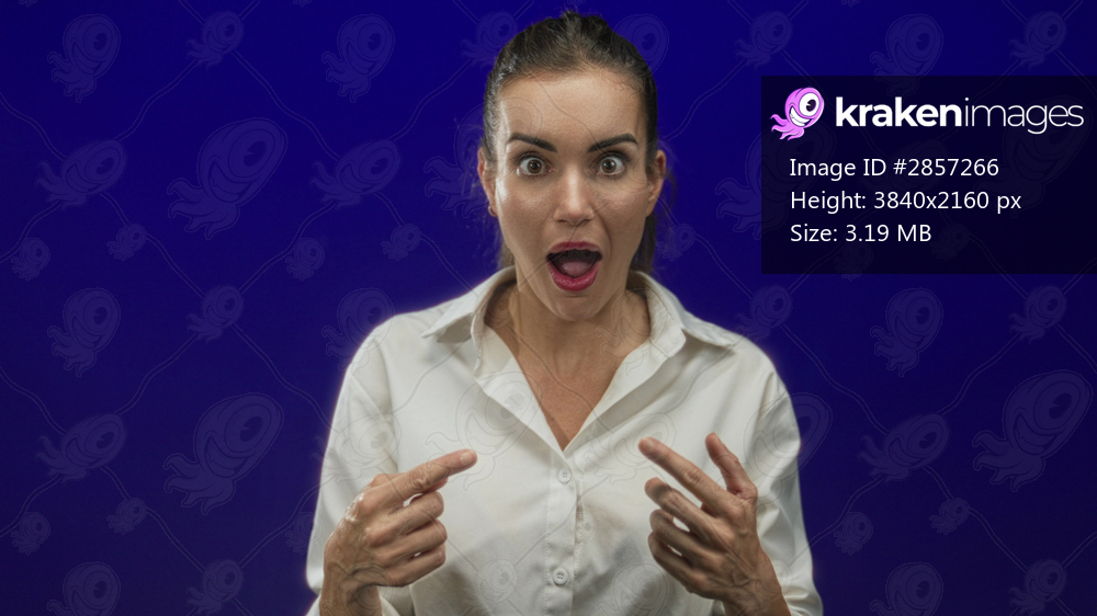 Woman in white shirt with open mouth points finger to chest in studio under blue light; surprise doubt.