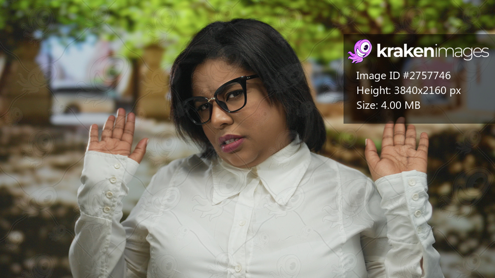 Woman in white shirt outdoors making dismissive gesture in park with trees visible behind, suggesting nonchalance in a sunny environment.