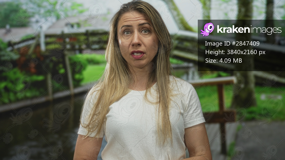Woman in white shirt pinches nose by wooden bench beside building among green foliage near canal; smell disgust.