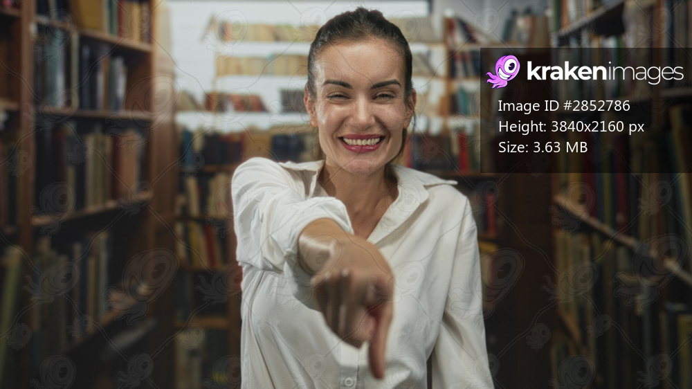Woman in white shirt pointing finger near bookshelves in a library building aisle; confidence empowerment.