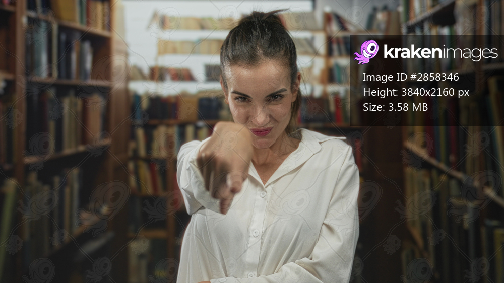 Woman in white shirt pointing finger near bookshelves in a library building aisle; confidence empowerment.
