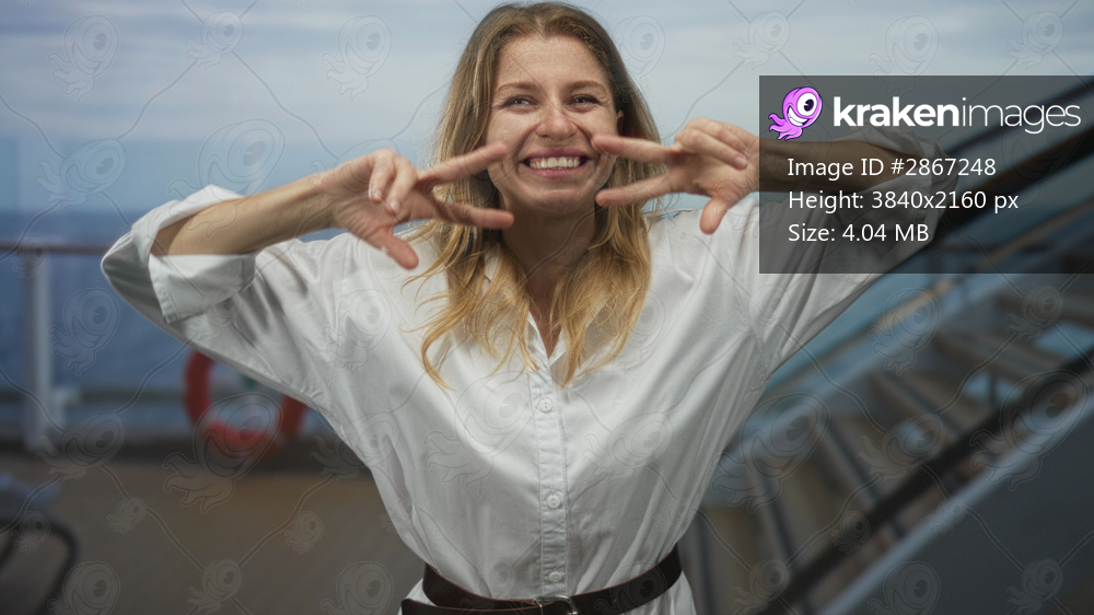 Woman in white shirt points finger to camera on cruise boat deck by lifebuoy and metal stairs, hands extended toward lens; joy travel adventure.