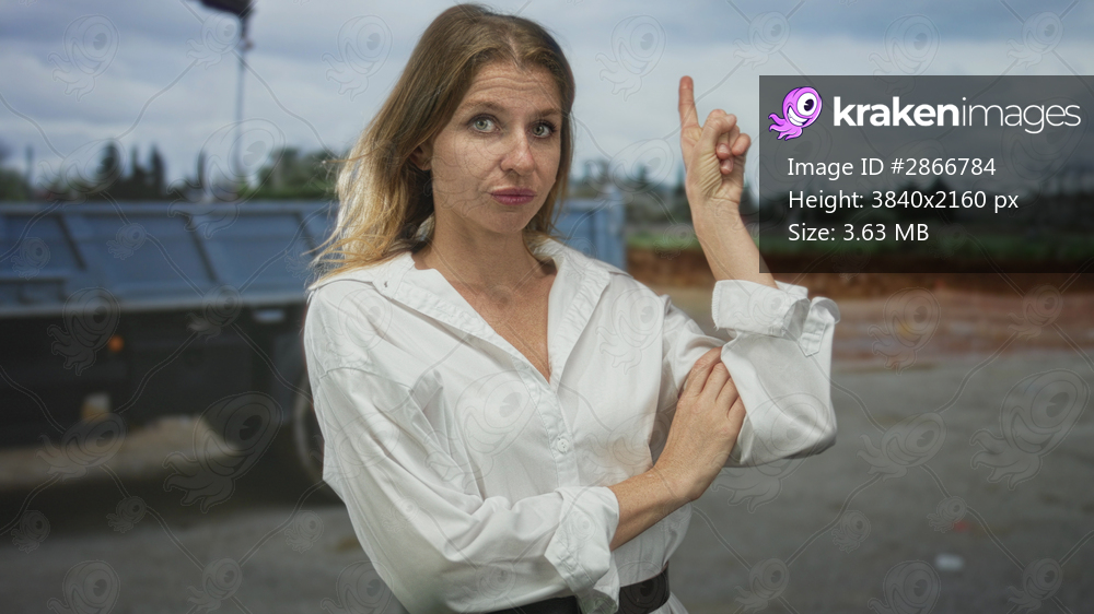 Woman in white shirt points finger upward and folds arm across chest on street beside truck and muddy lot; confidence.