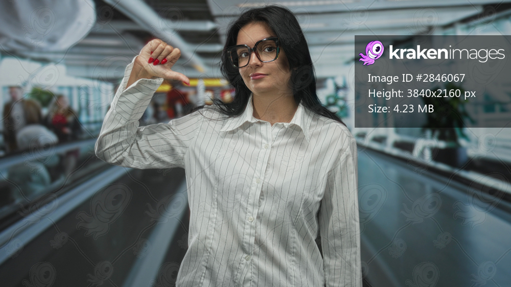 Woman in white shirt points finger upward and then shows thumb downward at airport terminal walkway; ambivalence.