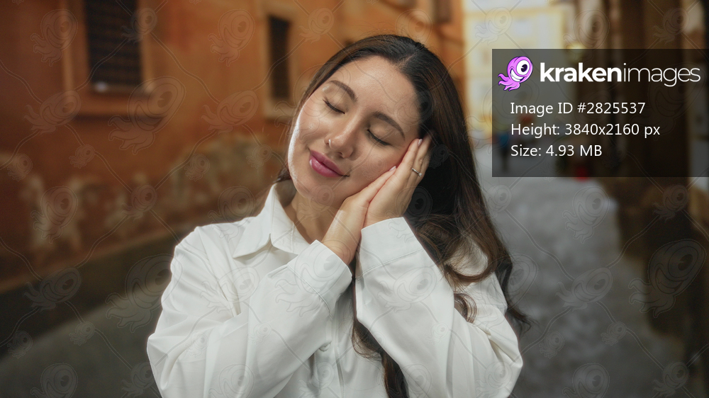 Woman in white shirt presses cheek to hands on a cobblestone old town street lined with rustic brick buildings; serenity.