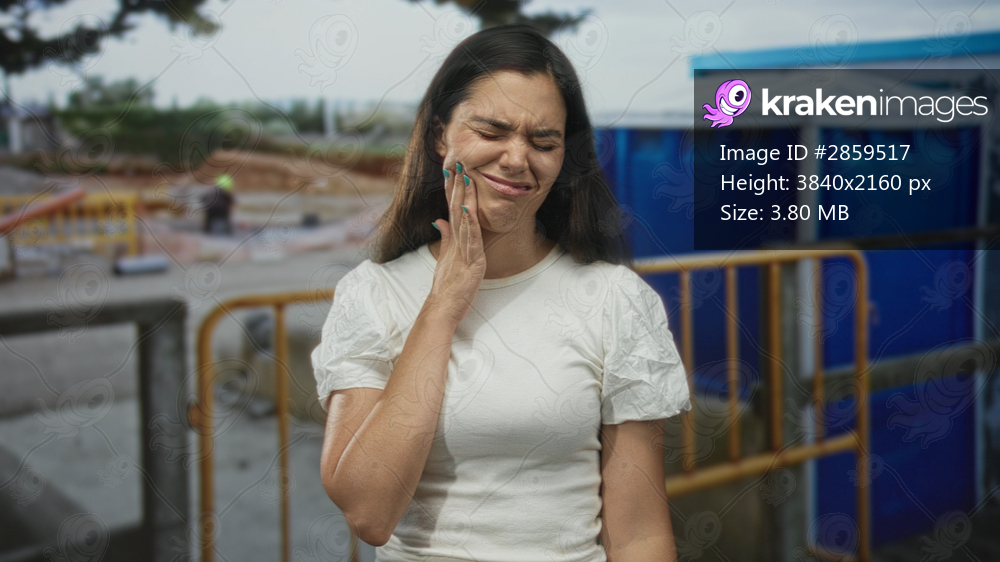 Woman in white shirt pressing her cheek for toothache at building site near temporary barrier fencing; pain.