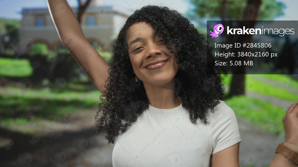 Woman in white shirt raises bare arms, smiles with closed eyes in front of a sunlit building; pure joy.