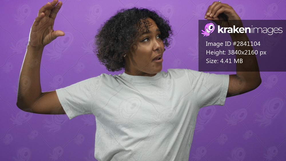 Woman in white shirt raises hands in purple studio with expressive posture and tilted head to frame an unseen viewpoint; curiosity.