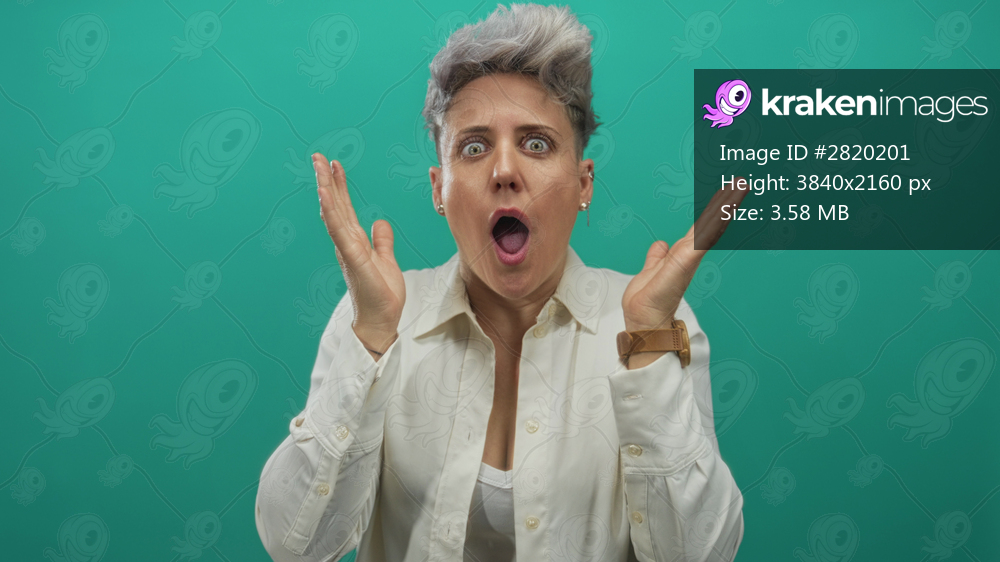 Woman in white shirt raising hands in shock gesture with open mouth in turquoise studio; surprise.