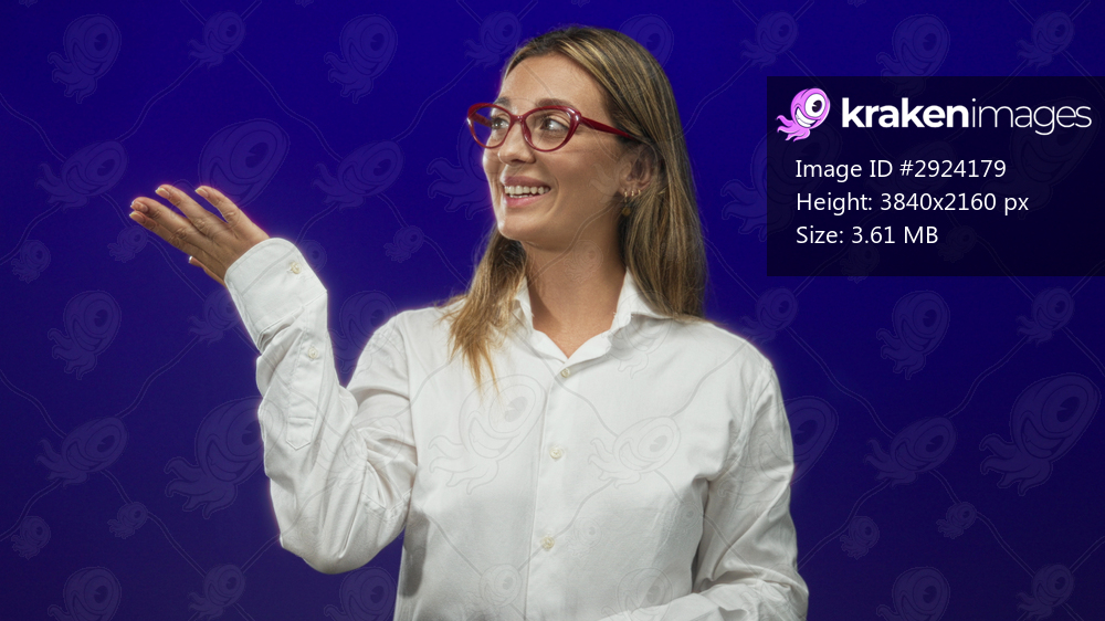 Woman in white shirt and red glasses raising her hand and smiling with clasped fingers in studio against deep purple wall; cheerful confidence.