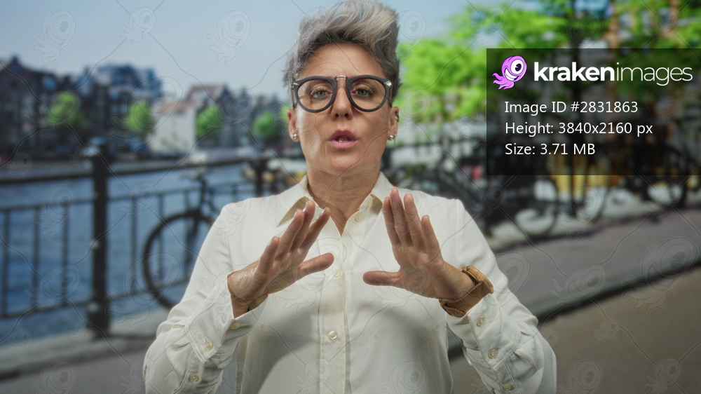 Woman in white shirt with short grey hair and glasses holds palms forward on urban canal street, bikes behind railing; confidence boundary resilience empowerment. - Kraken Images