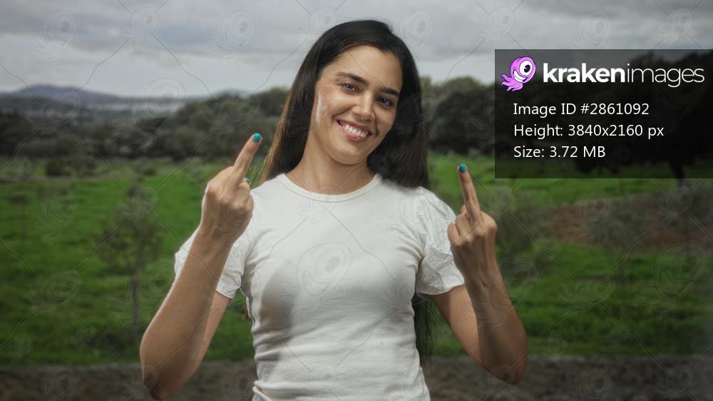 Woman in white shirt showing both middle fingers with raised arms in green forest clearing under cloudy sky; defiance.