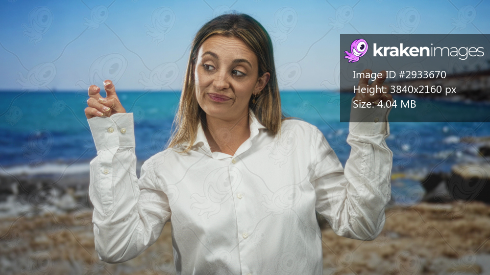 Woman in white shirt shrugs shoulders in studio seaside set with hands raised and smirk on face; skepticism.