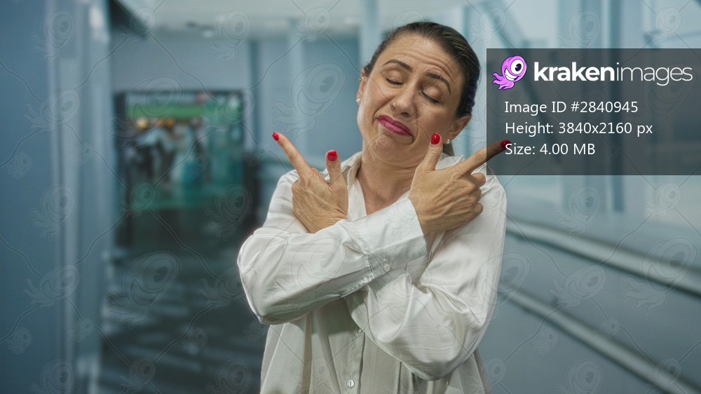 Woman in white shirt with skeptical expression finger pointing down a corridor in airport terminal; uncertainty.