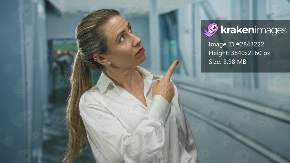 Woman in white shirt with skeptical expression finger pointing down a corridor in airport terminal; uncertainty.