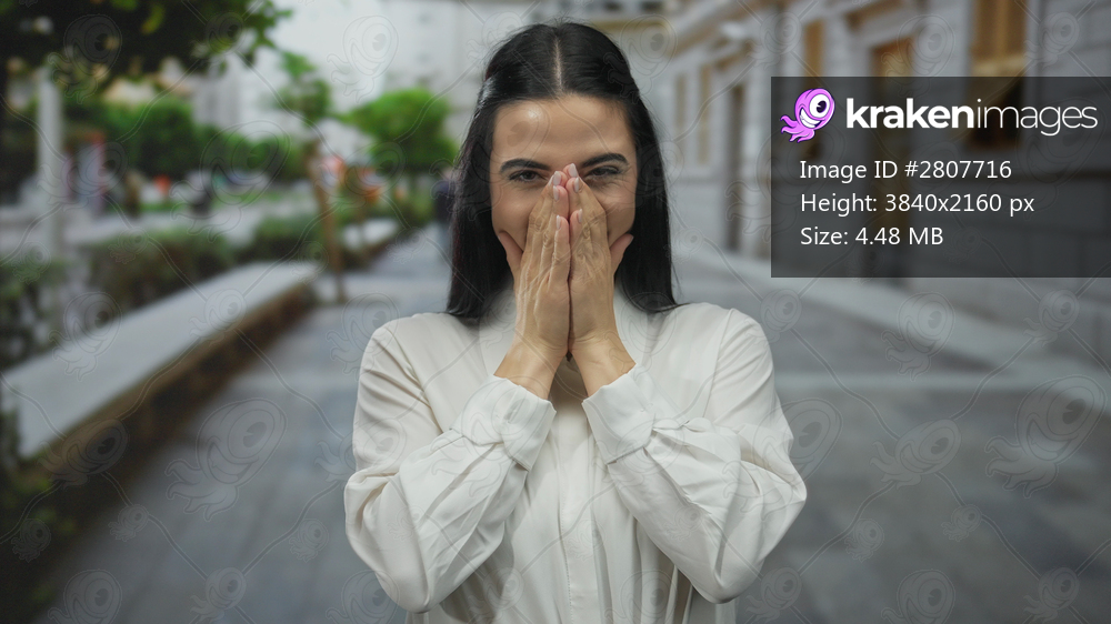 Woman in white shirt smiling on an urban street, showcasing lively hispanic culture in an outdoor city setting.