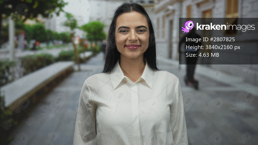 Woman in white shirt smiling on an urban street, showcasing lively hispanic culture in an outdoor city setting.