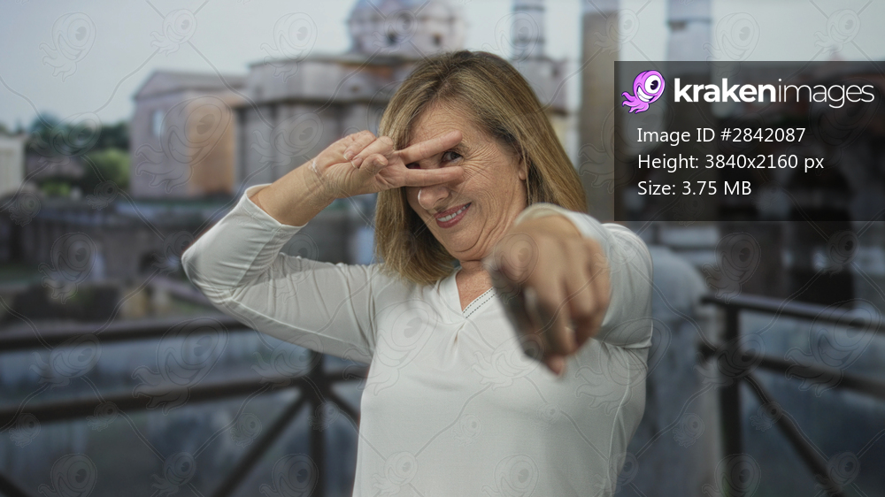 Woman in white shirt smiling and pointing finger and making a peace sign at ancient ruins building; playfulness.