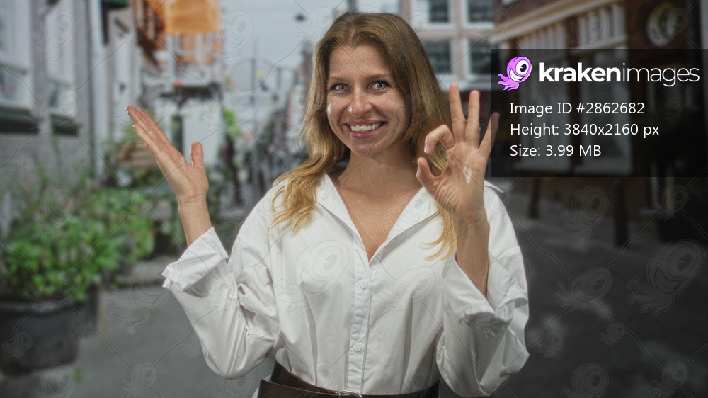 Woman in white shirt smiling and pointing with right hand to open left palm while posing on cobbled street lined with shops; friendly.